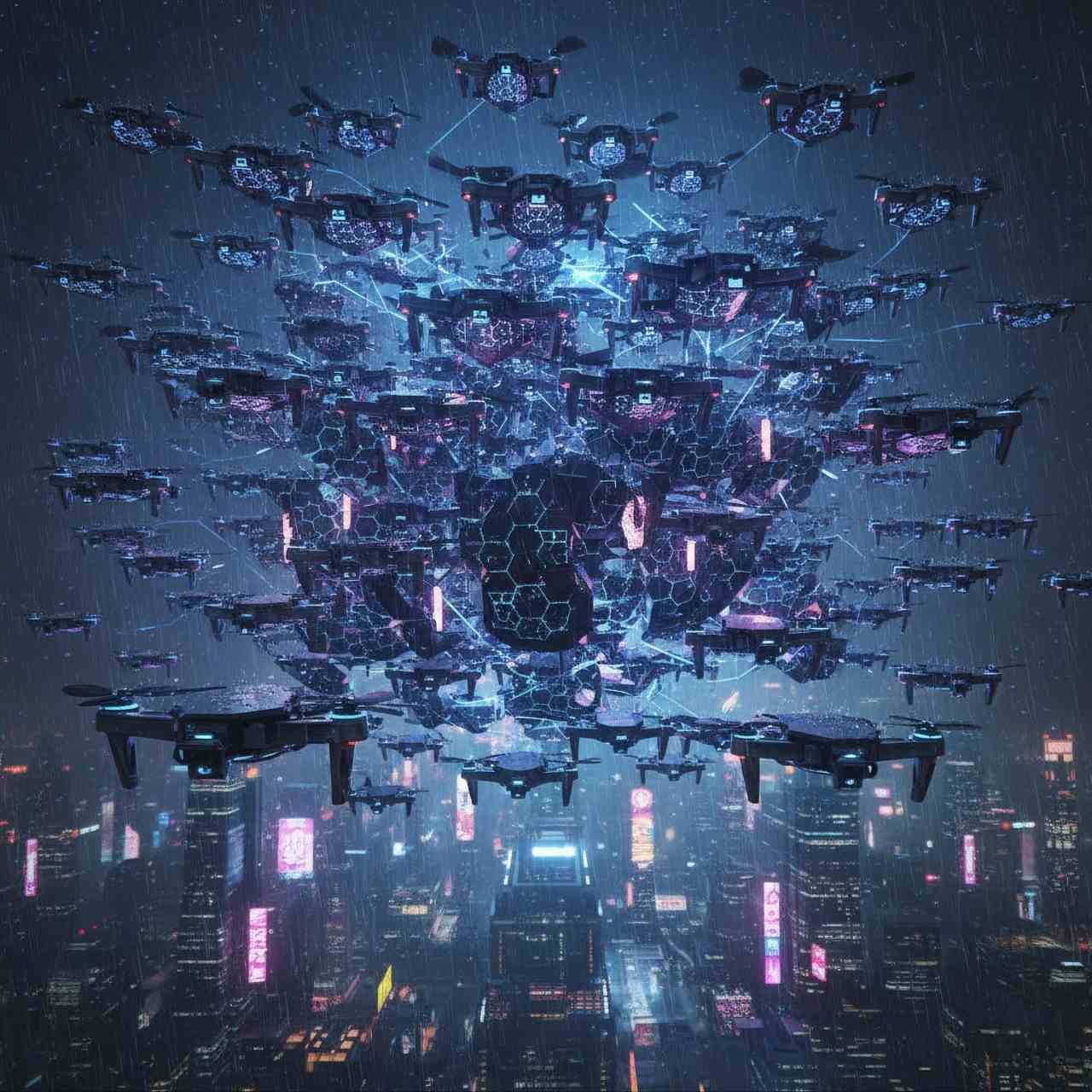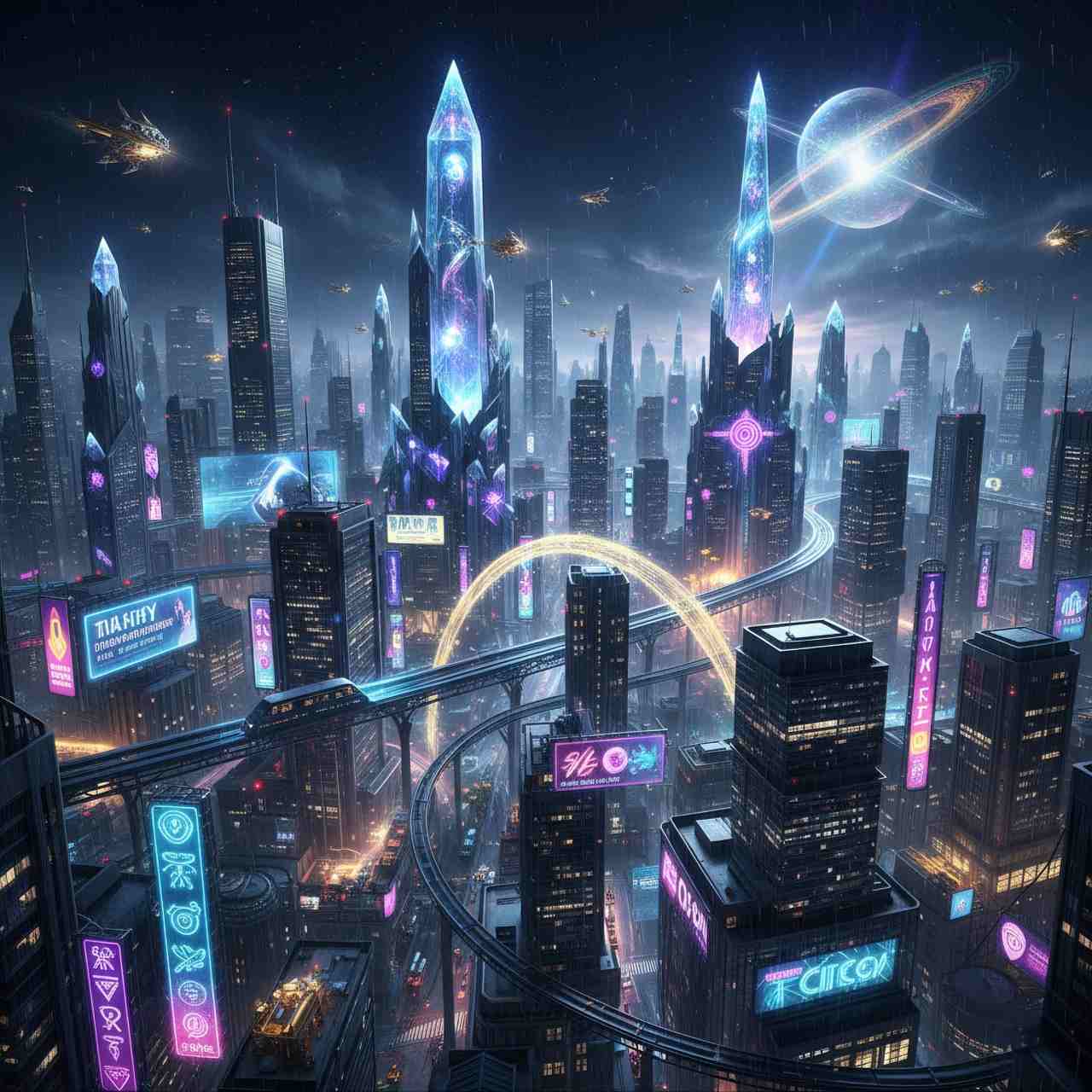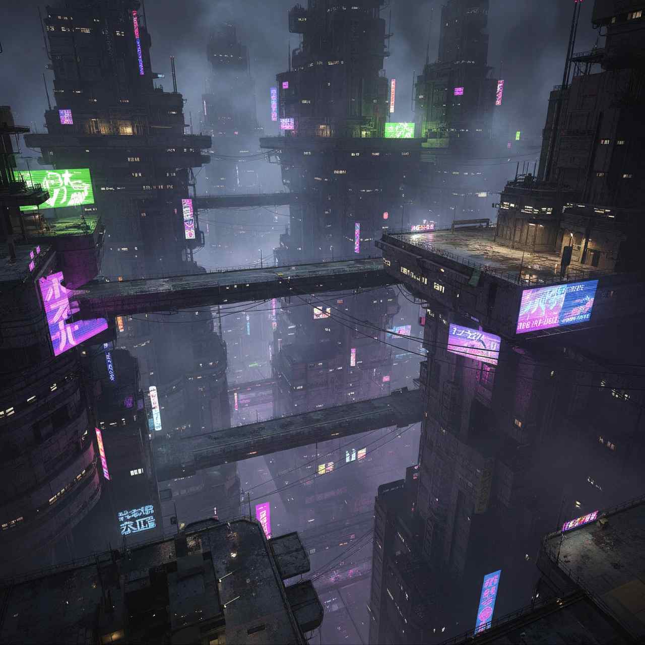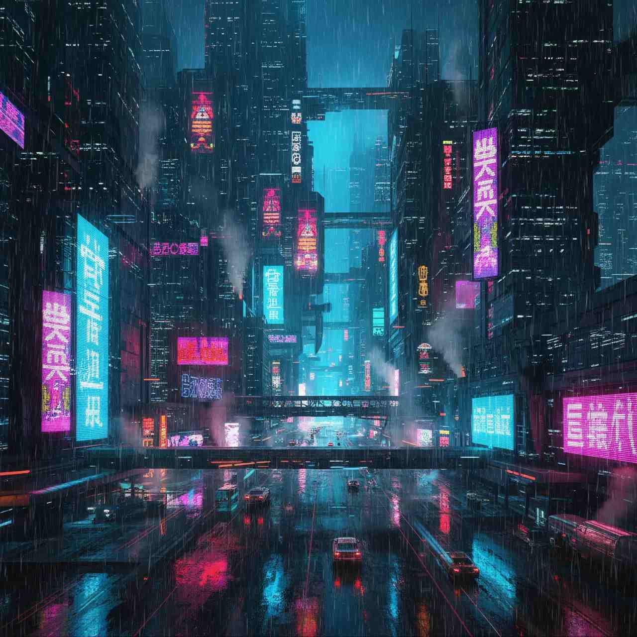 - Cyberpunk(サイバーパンク): 闇夜、雨、ネオン、高層ビル。