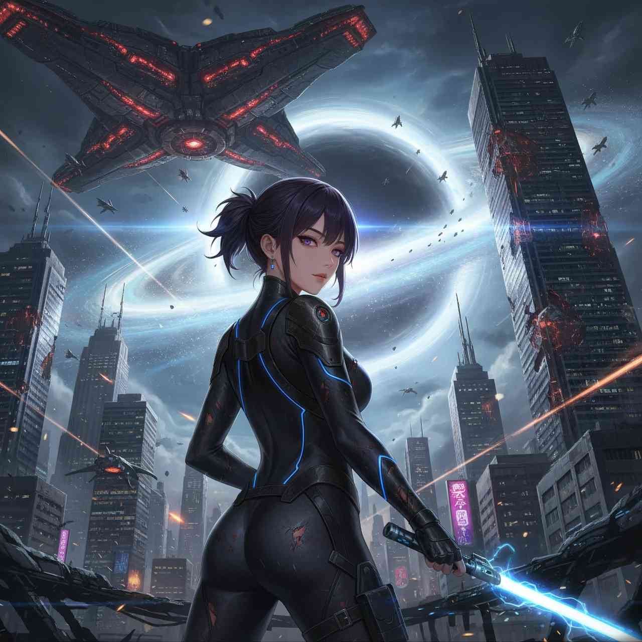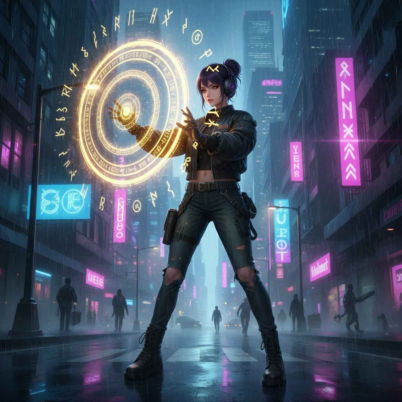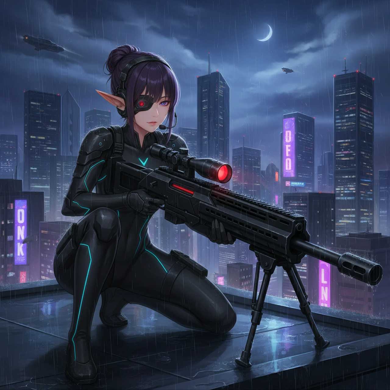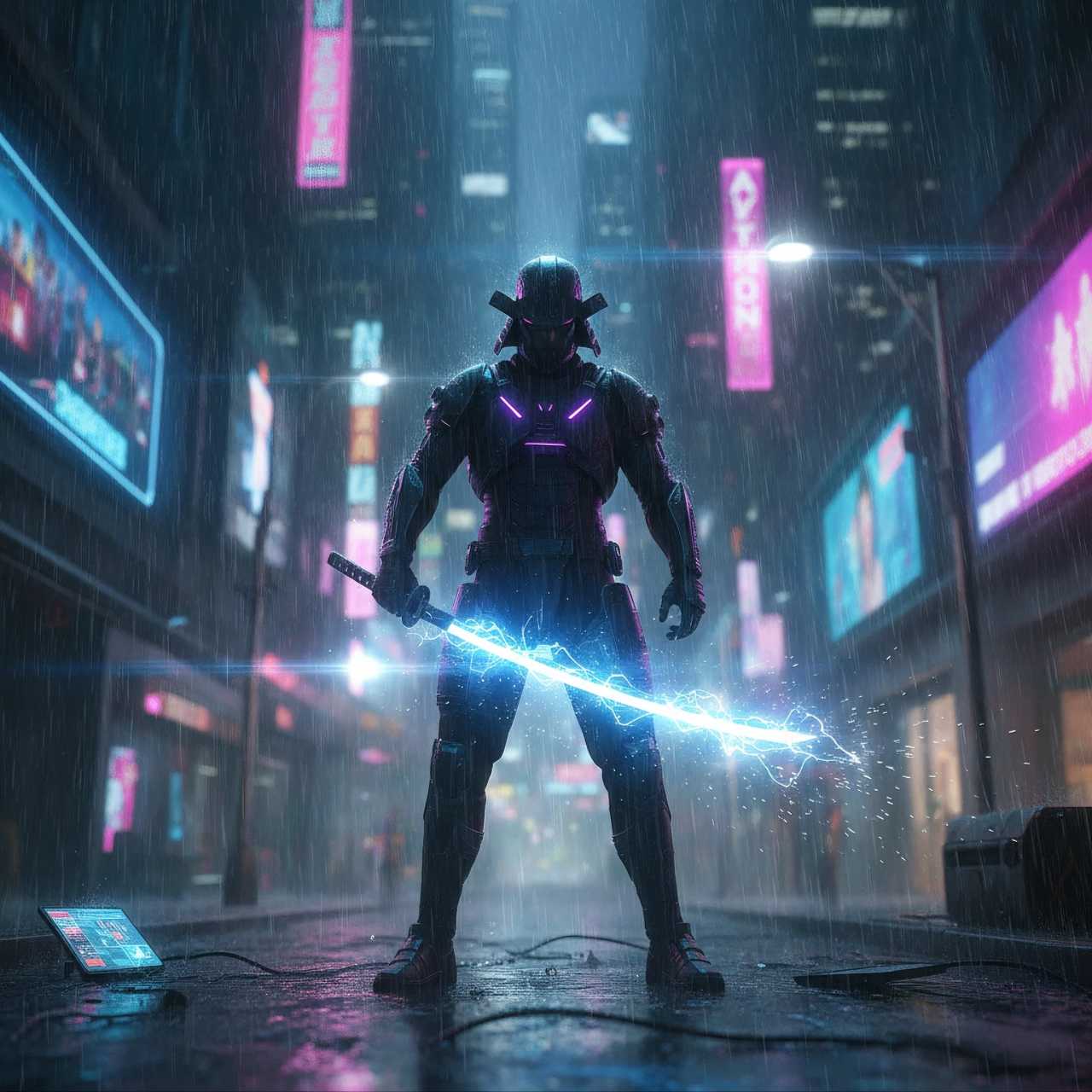 - イメージ: 土砂降りのサイバーパンク都市。主役は、傷だらけの強化スーツを着たサイボーグ。背景には霞んだ巨大な摩天楼がそびえ、ネオンが雨粒に反射している。映画のような横長フレアと、ピントの合った鋭い質感が特徴。