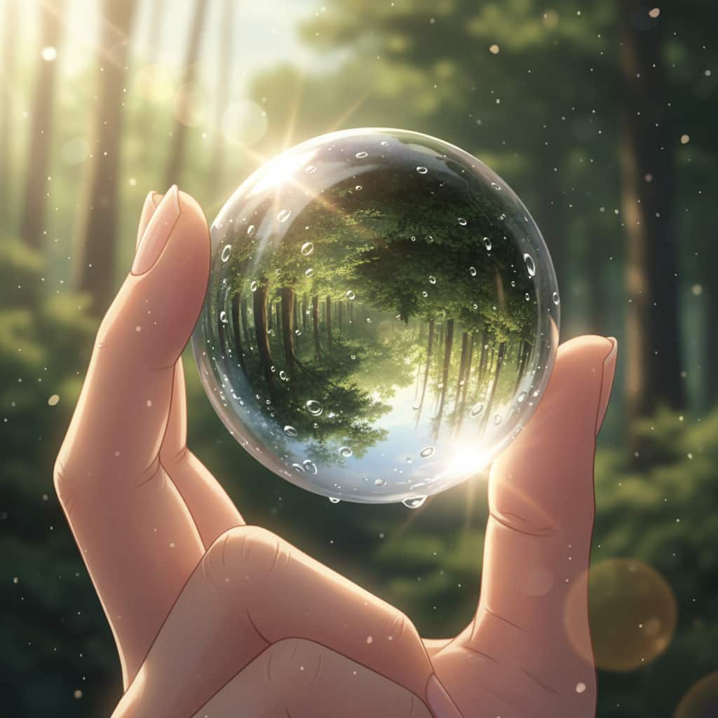 指先で持つ透明なガラス玉をクローズアップ