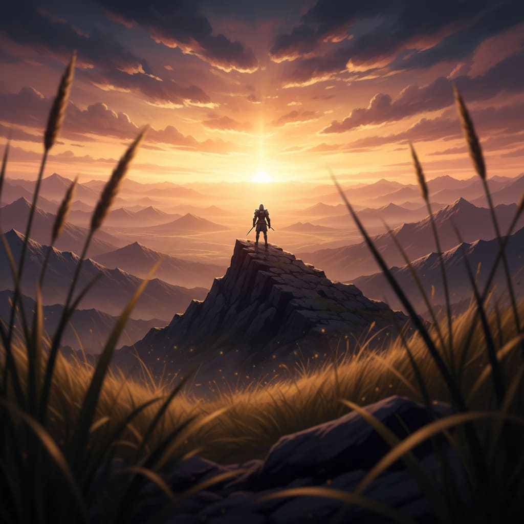 A knight standing on a mountain peak, **blurred foreground grass**, **sharp focus** on the distant figure, dramatic sunset, fantasy concept art