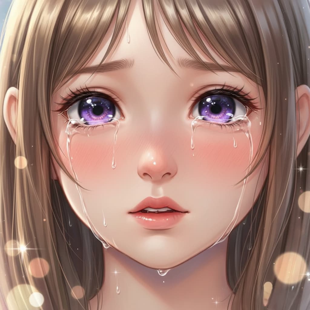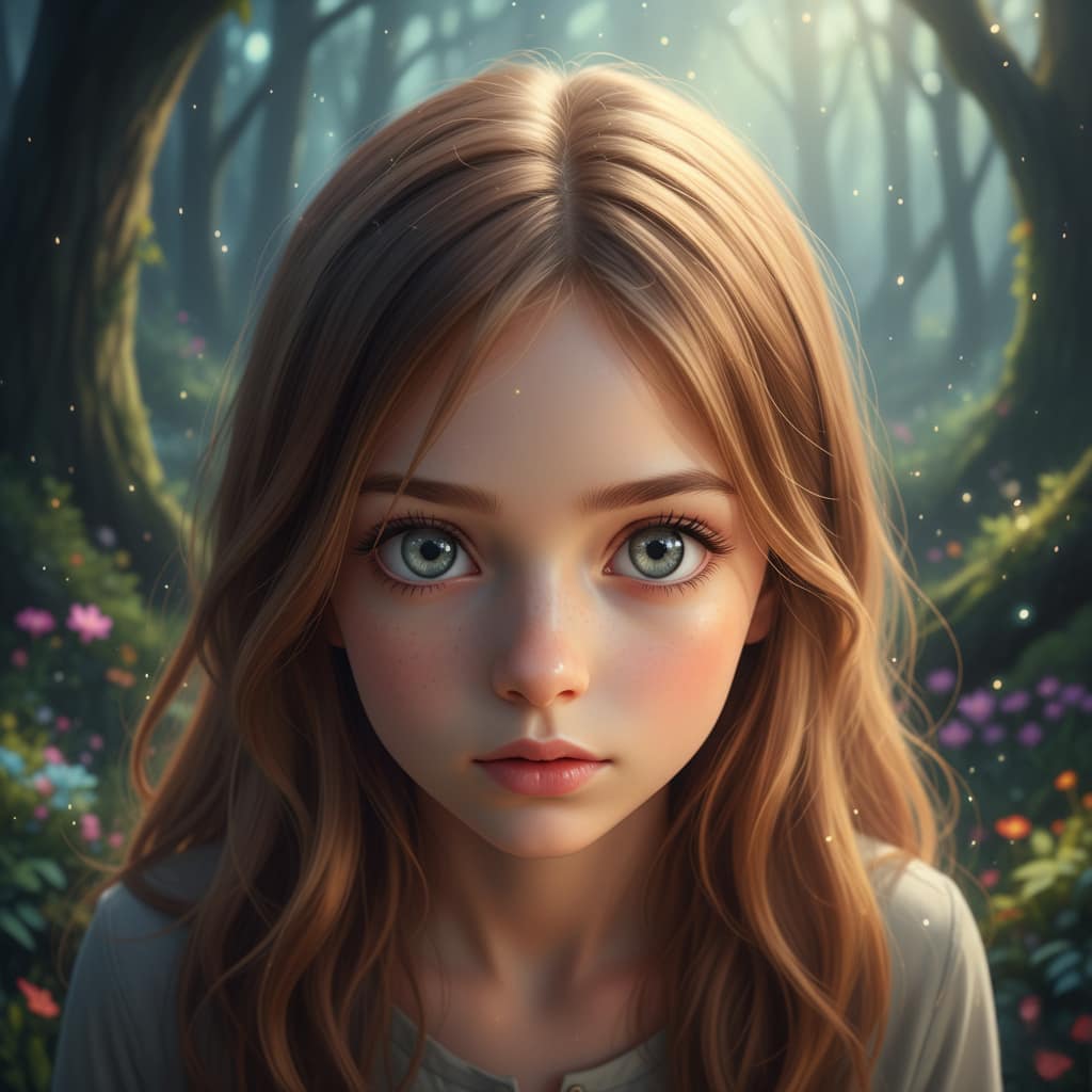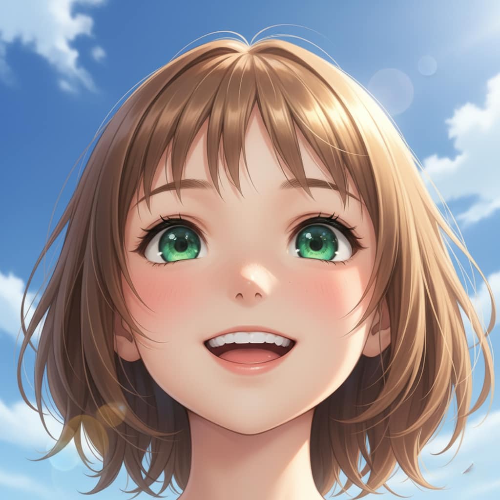 プロンプト例: リアルなアニメスタイル、女の子の顔の**超クローズアップ**、**ハイアングルショット**(上から下を見下ろして)、柔らかな光、精細な目、繊細な表情、美しい髪の流れ、焦点が合っていないファンタジーの森の背景、映画のような照明、8K、最高品質、超詳細
