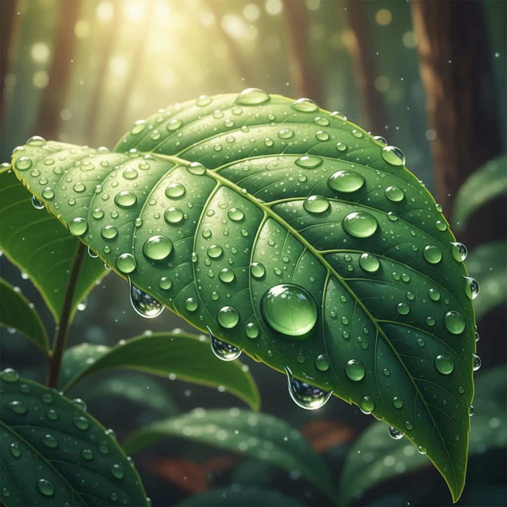 - 期待される結果: 葉っぱの上のテントウムシと水滴が画面いっぱいに描かれ、葉の葉脈や水滴の透明感が強調されたイラスト。