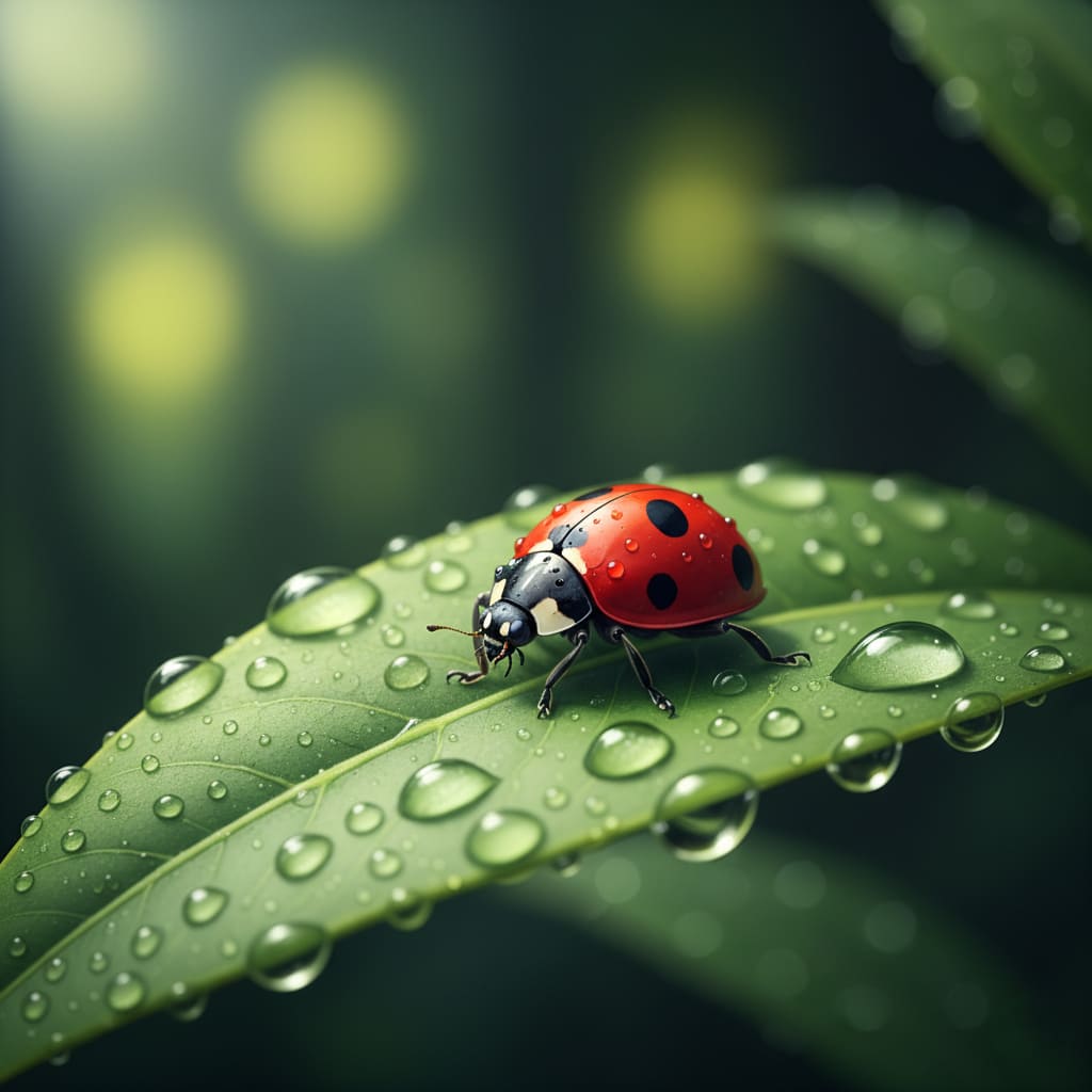 **Macro focus** on a tiny ladybug on a wet green leaf, detailed water droplets, **extreme close-up**, dramatic lighting, realistic anime style