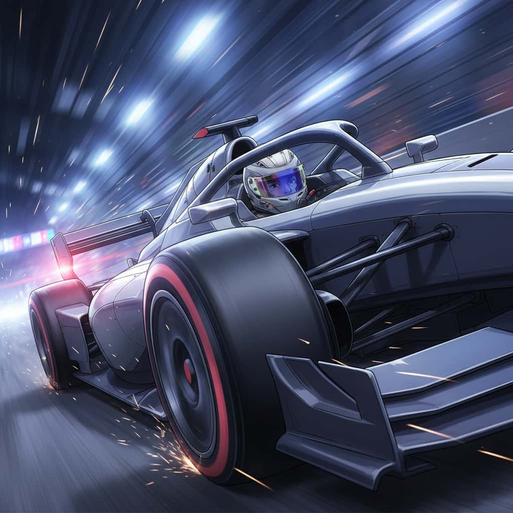 - 期待される結果: レーシングカーのドライバーのヘルメットは鮮明である一方、車輪や背景は横方向に激しくブレており、猛スピード感が表現されたイラスト。