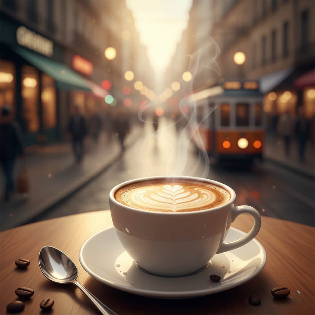 プロンプト例: ハイアングルで撮影されたカフェのテーブル、手前に置かれたコーヒーカップにフォーカスが合っており、奥の通りはぼけている