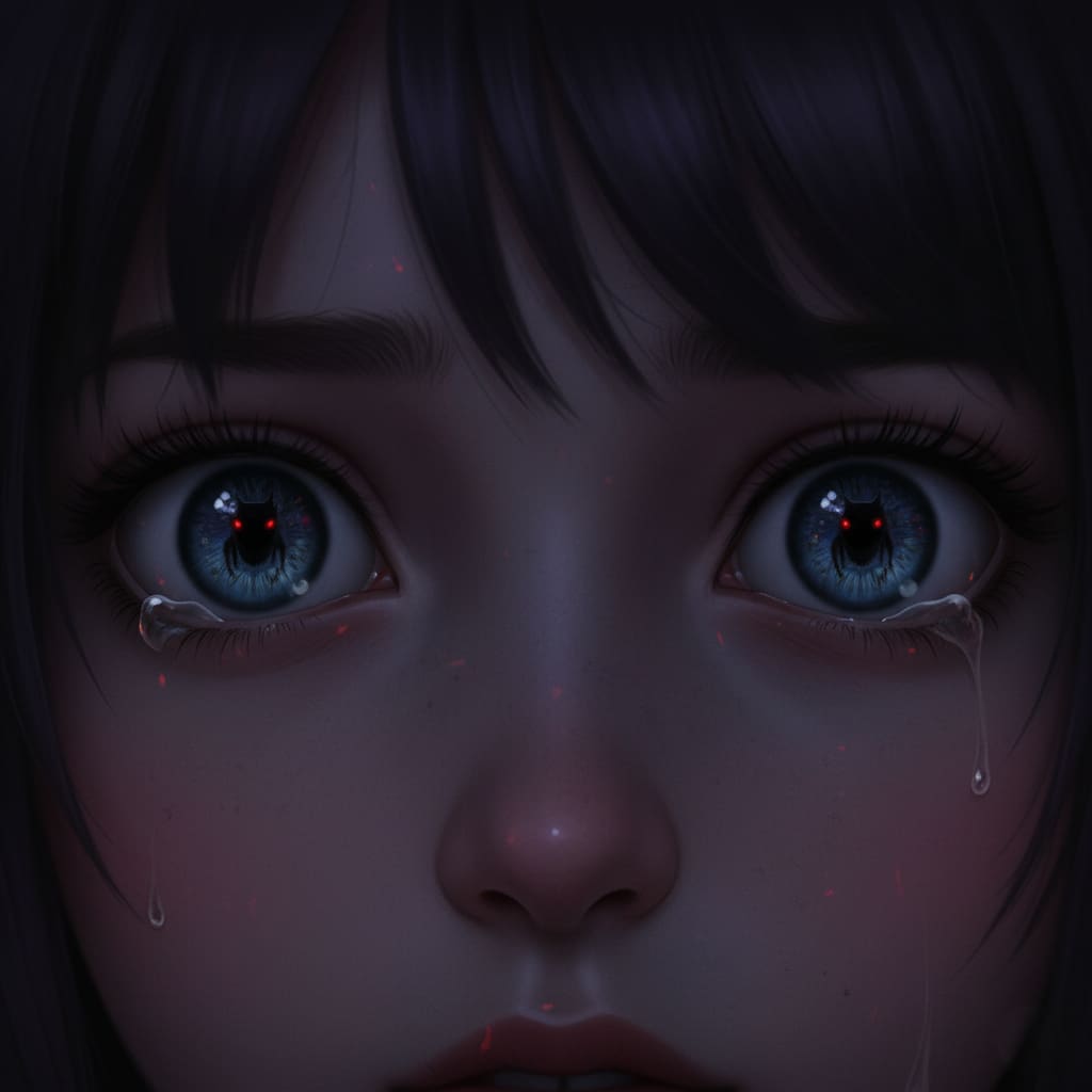 A girl's eyes filled with fear, **intense focus** on the reflection in her pupils, **extreme close-up**, dark and mysterious atmosphere, anime style