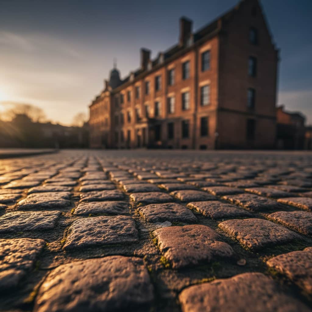 プロンプト例: ローアングルから撮影された、古いレンガ造りの建物の写真、手前の石畳にシャープなフォーカスが合っており、奥の建物はぼけている