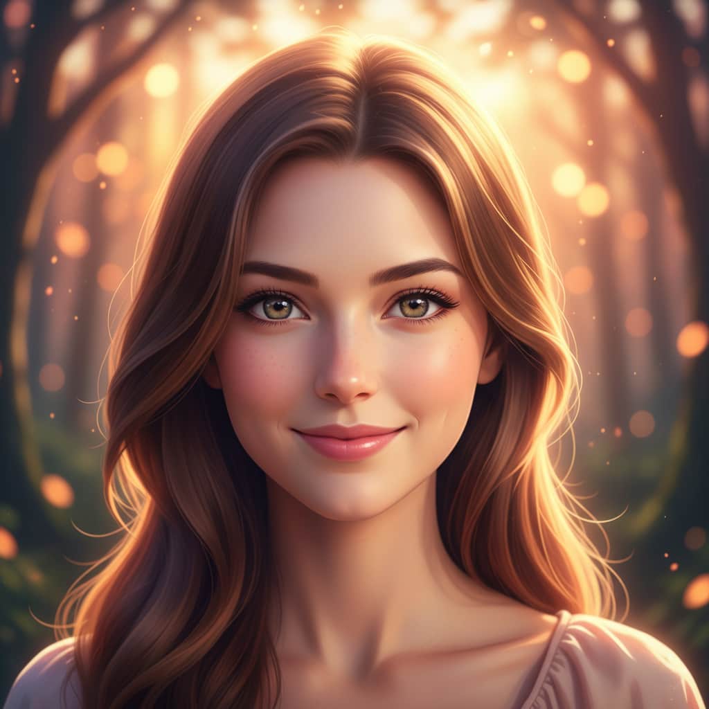 A beautiful young woman smiling, **sharp focus** on her face, **shallow depth of field**, **bokeh** background, cinematic lighting, photorealistic anime style
