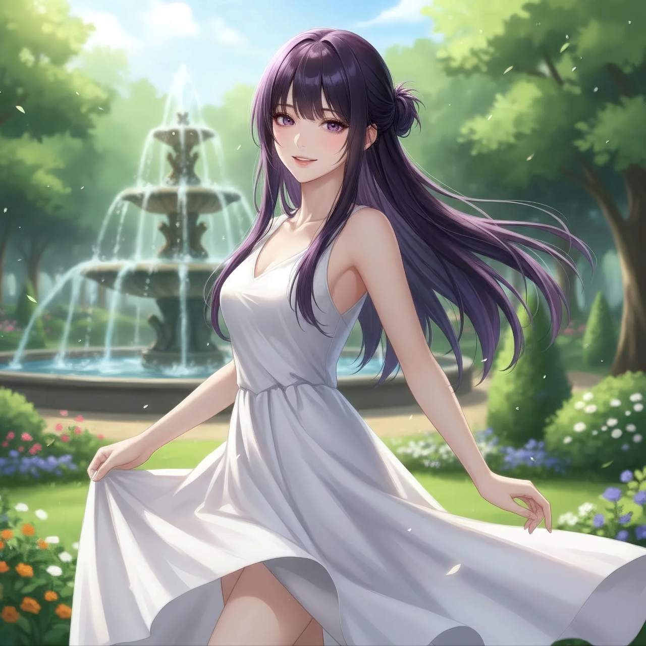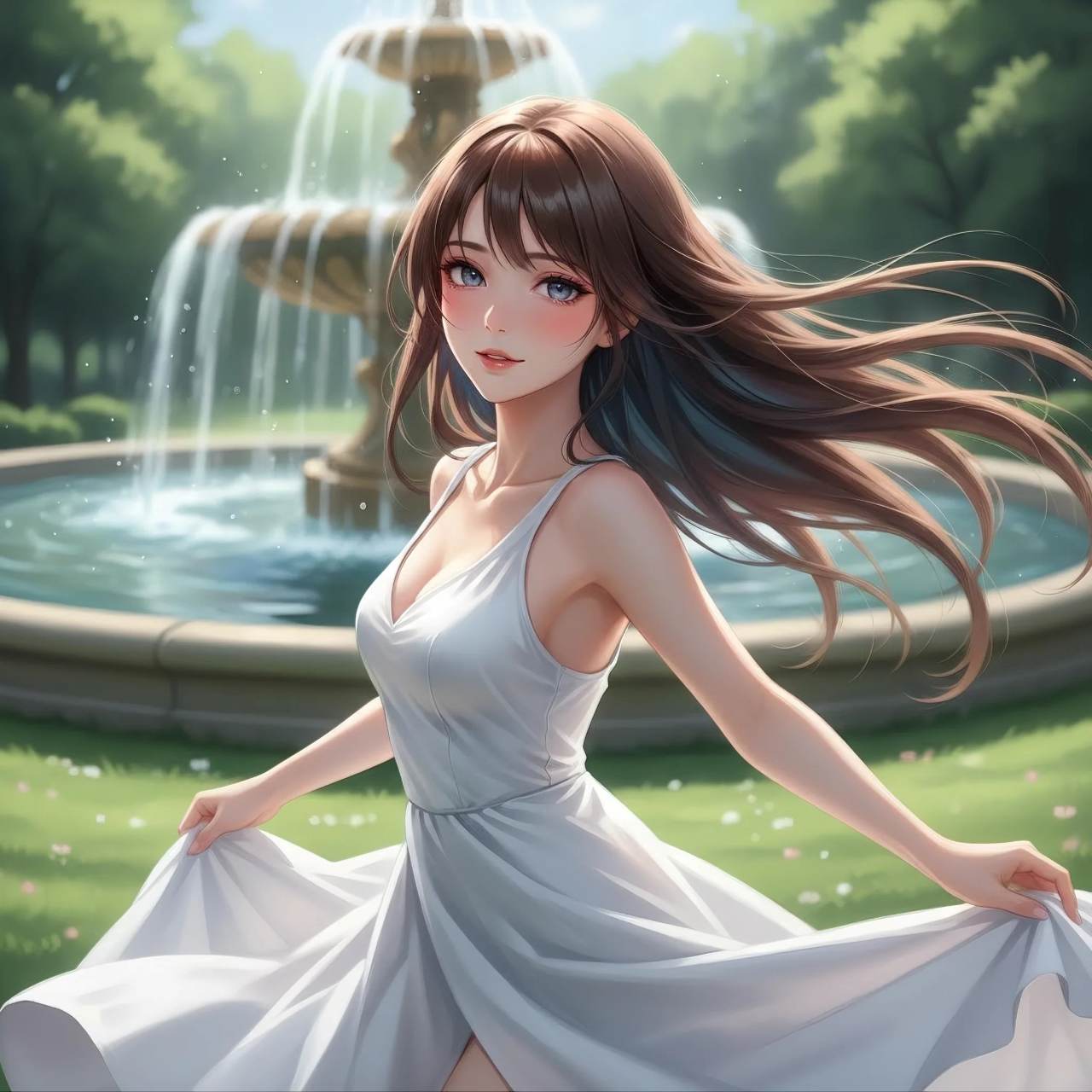 - 傑作、最高品質、8k、不条理な解像度、ポートレート、上半身のショット、頭が画面の外に途切れない、透明感のある肌、色っぽい目元、ほんの少しだけ頬を赤らめる、潤いのある艶やかな唇、美しく詳細な目、複雑に描かれた目と瞳孔、誘惑的な瞳、潤んだ瞳、複雑な虹彩の模様、伏し目がちな目、ロングヘア、サラサラな髪、髪が風でなびく、ミステリアスな雰囲気、白いワンピース、こちらを見る、笑顔、踊る、スカートがなびく、斜め前からの眺め、噴水、緑あふれる公園、ボケ、モーションブラー
