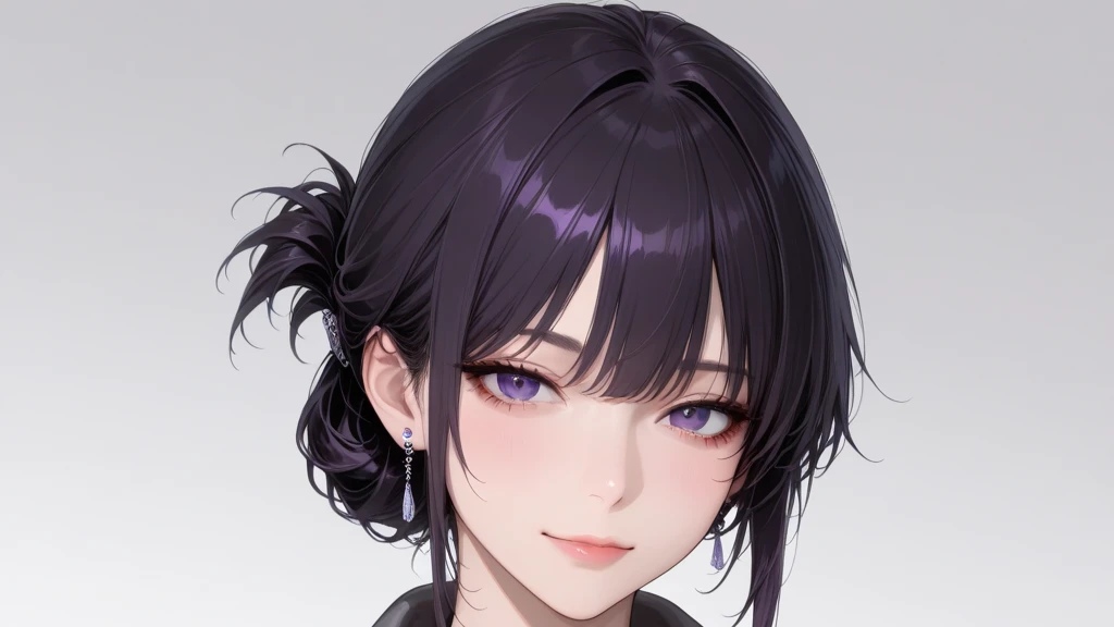 プロンプトでは髪の色は設定していません。しかし、添付画像を参考にしているはずなので、髪色は「紫がかった黒色」正解です。