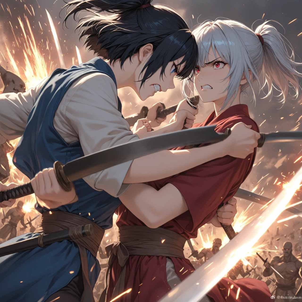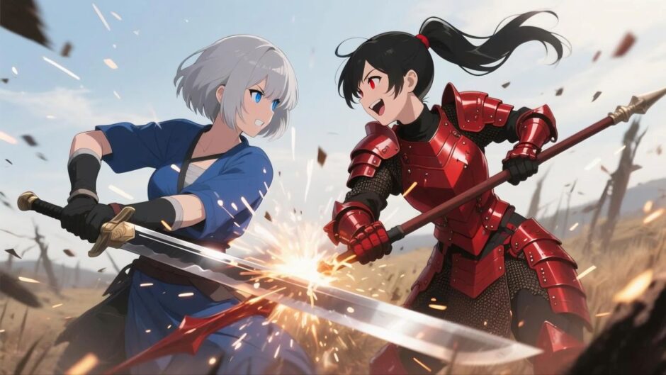 アニメ風、傑作、最高品質、女性二人、対面戦闘、激しい戦闘、火花が散る、モーションブラー、荒野の戦場、横顔、ローアングル、BREAK、左の女性、銀髪、ボブヘア、青い目、青い布の服、真剣な表情、歯を食いしばる、1本の剣、斬撃、BREAK、右の女性、黒髪、ポニーテール、赤い目、赤い金属鎧、笑い、槍、斬撃、