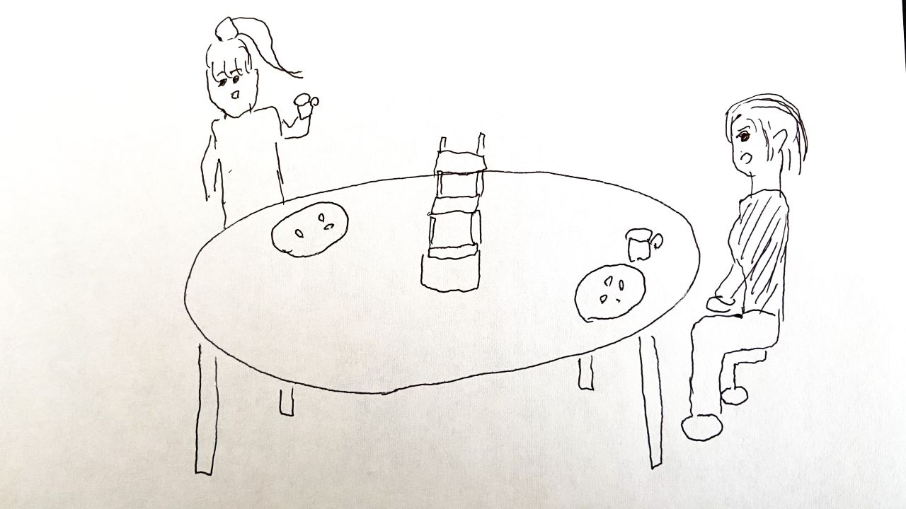 ザックリ言うと、ポニーテール女子とショートヘア女子が、アフタヌーンティーを楽しんでいるシーンですね。