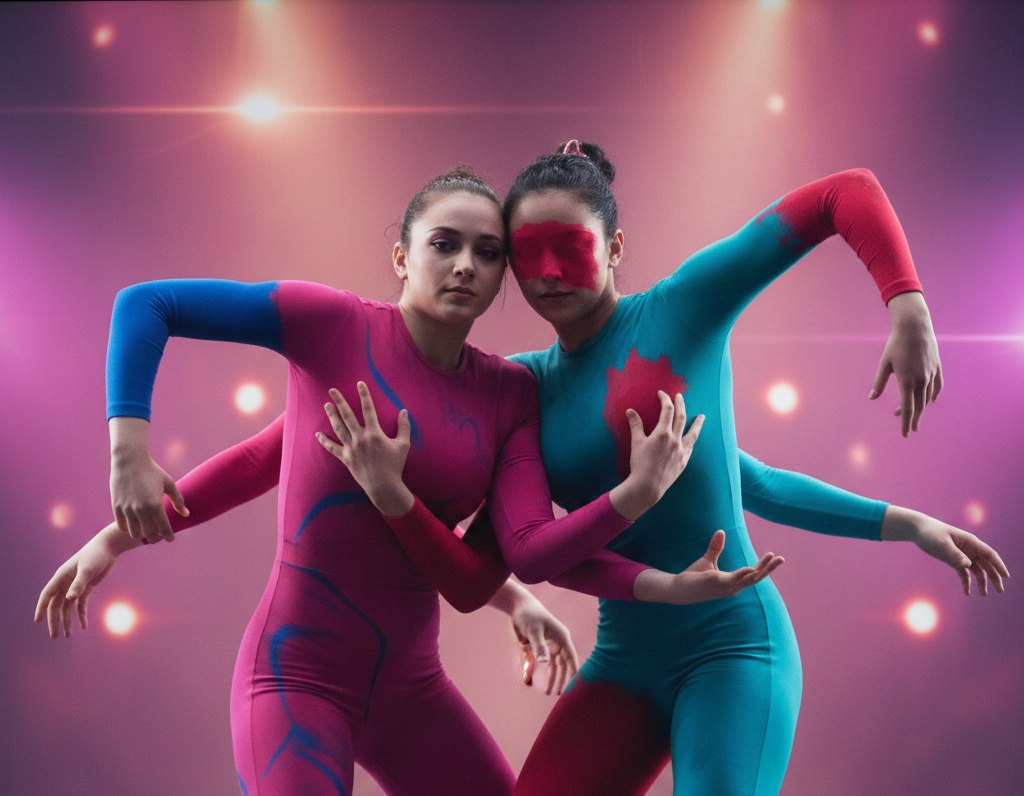 躍動感のあるアクロバット演技。上の女性は空中で抱え込み宙返りをしており、鮮やかなネオングリーンのレオタードを着ている。それとは対照的に、下の女性は地面にしっかり立ち、黒い運動服を着ている。二人の体の間にははっきりとした隙間があり、それぞれの腕や脚は明確に分かれている。