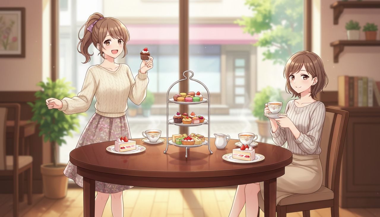 下の画像は、添付画像を乗せて、単純に「アニメスタイル、二人の女性がアフタヌーンティを楽しんでいる」というプロンプトを指示したものよ。