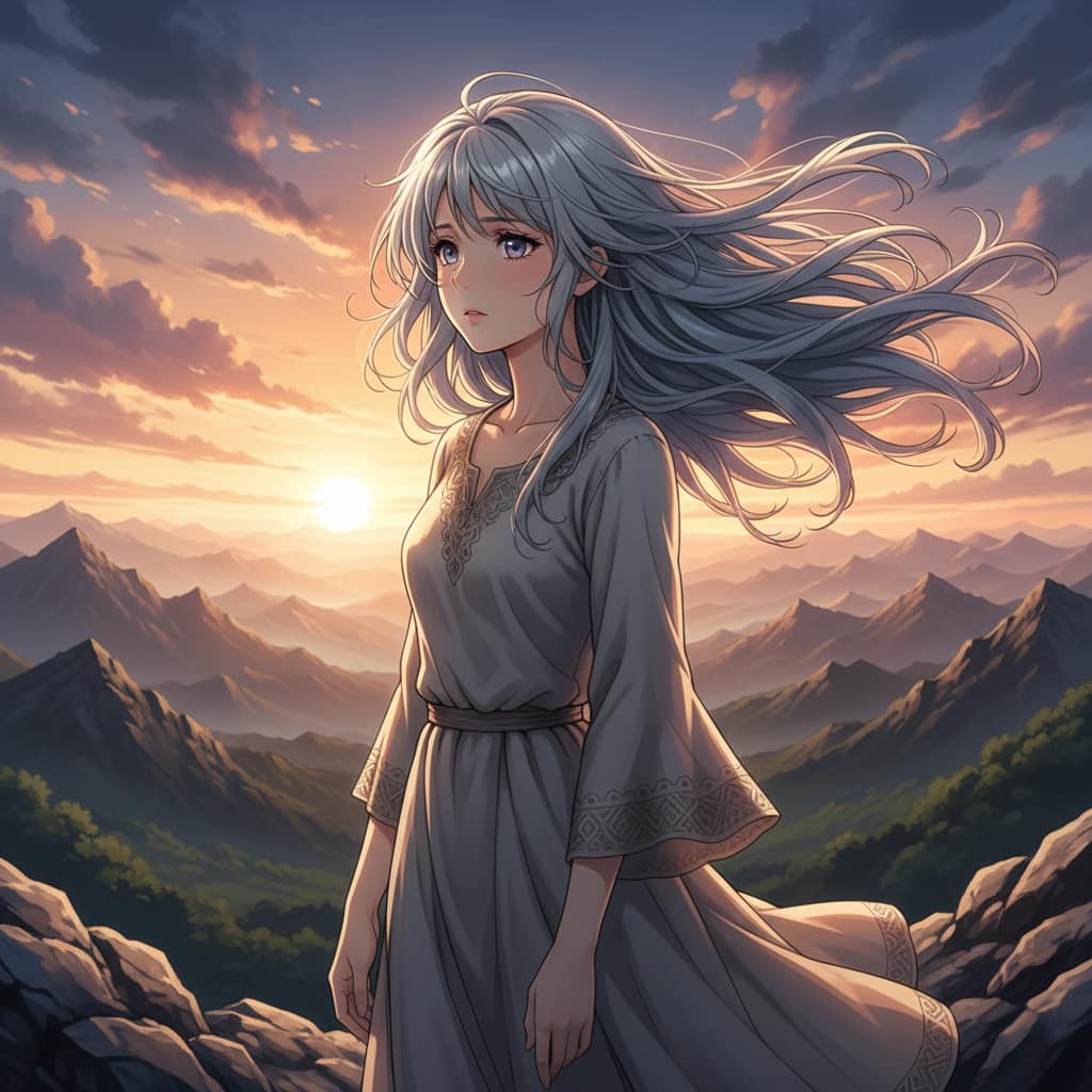 anime style, long flowing silver hair, pensive expression, hair blowing in the wind, looking into the distance, dramatic sunset, mountain landscape
