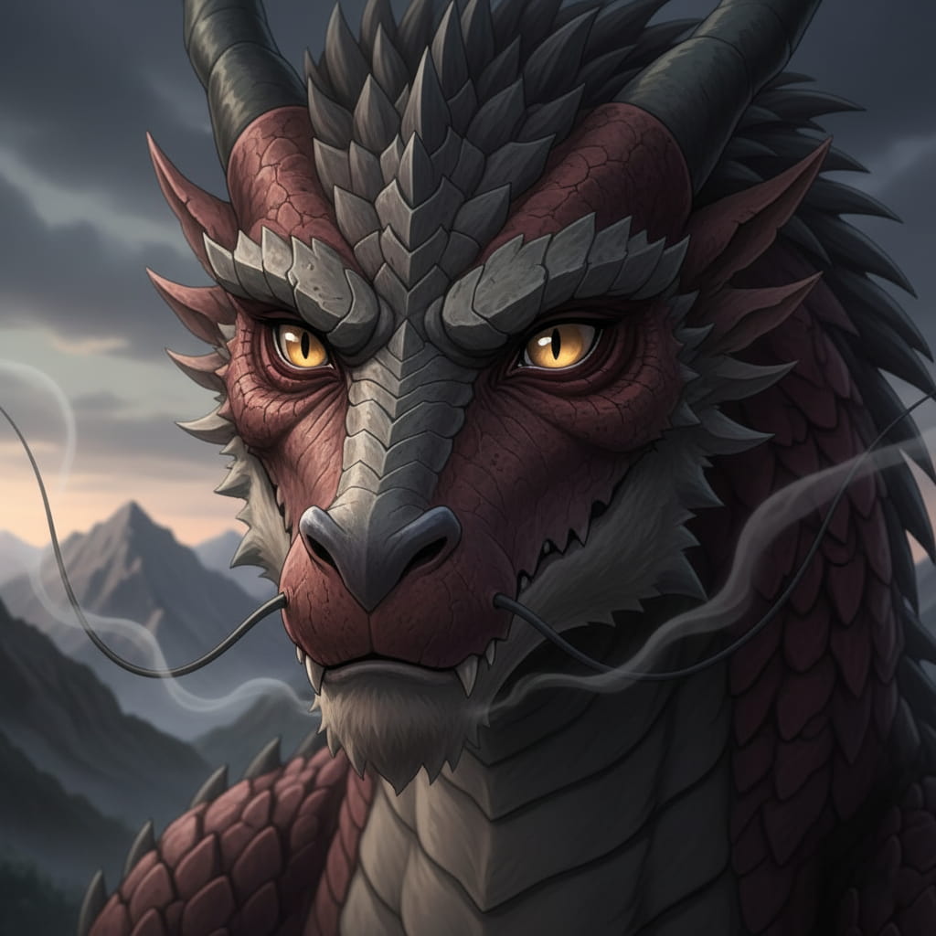 anime style, close-up of a powerful dragon, intelligent yet melancholic expression, ancient scales, glowing eyes, smoky breath
