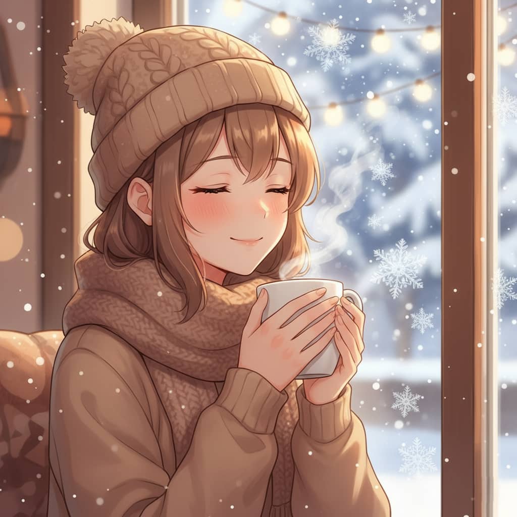 anime style, person, relieved expression, sipping hot cocoa by a window, snowy winter day outside, warm cozy atmosphere
