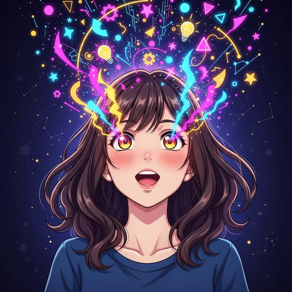 anime style, flash of creative inspiration, sparkling wide eyes, look of epiphany, lightbulb ideas above head, vibrant colors, magical glow
