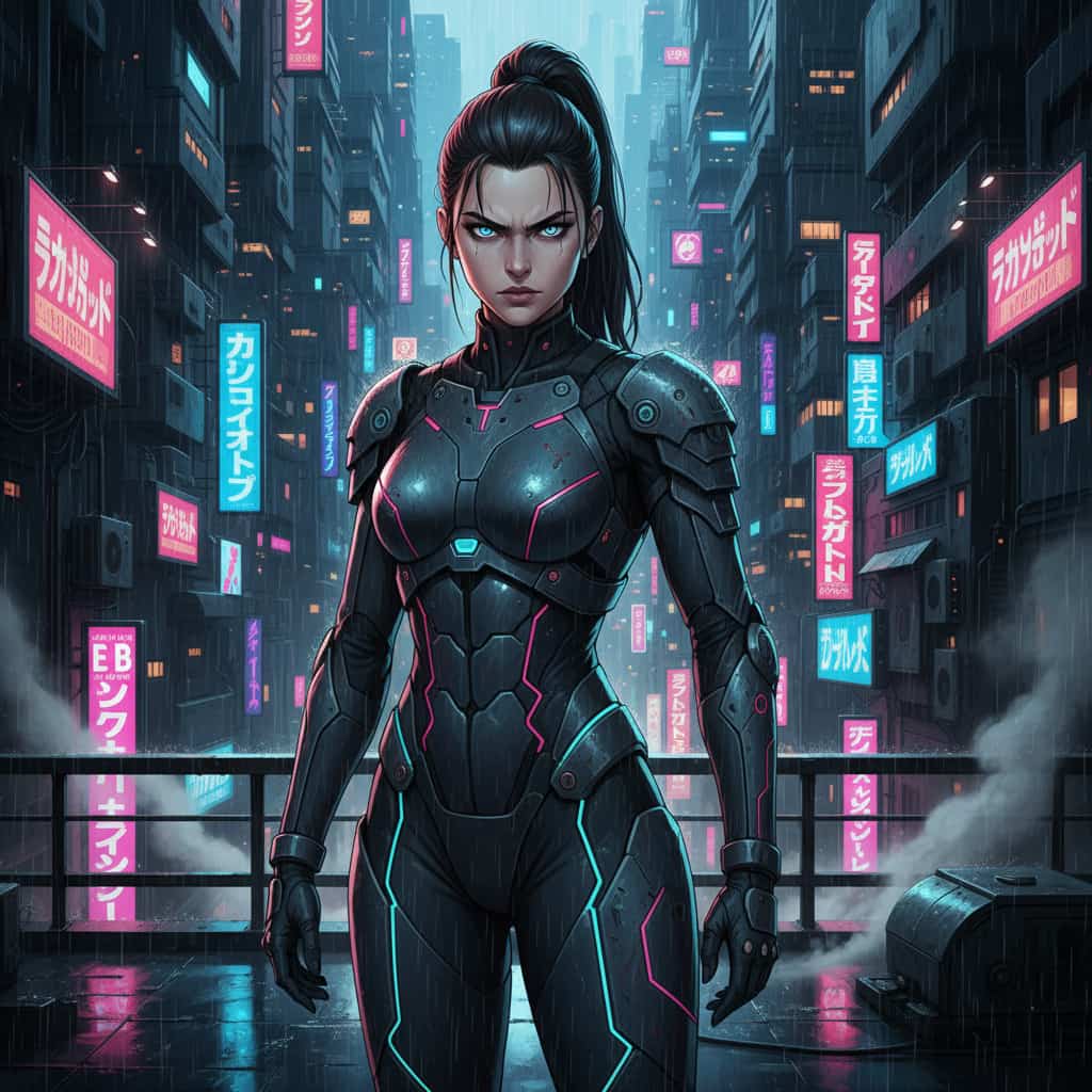 anime style, futuristic combat suit, determined and stern expression, glowing lines, neon city background, cyberpunk art style, high detail