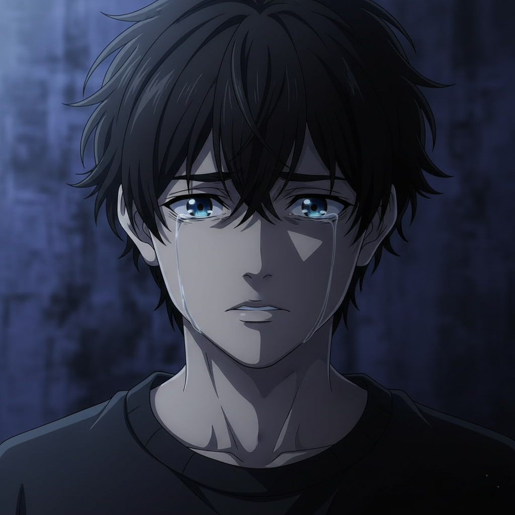 anime style, deeply sorrowful expression, half face in shadow, dramatic lighting, tear running down cheek