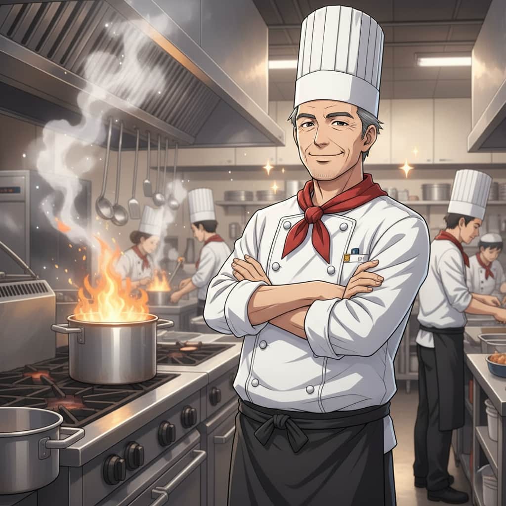anime style, experienced chef, satisfied smile, arms crossed, bustling kitchen background, steam and delicious aroma