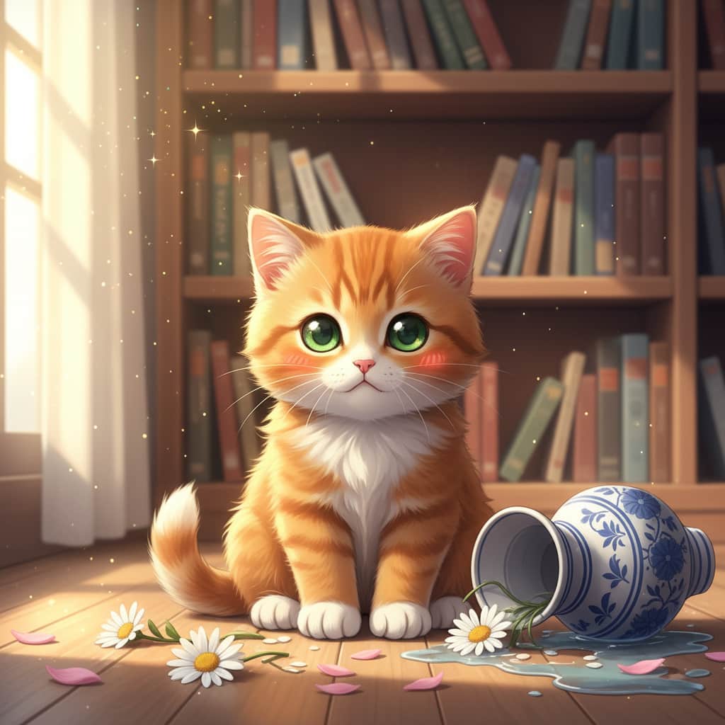 anime style, mischievous kitten, guilty expression, knocked over a vase, flowers scattered, messy room, blush on cheeks