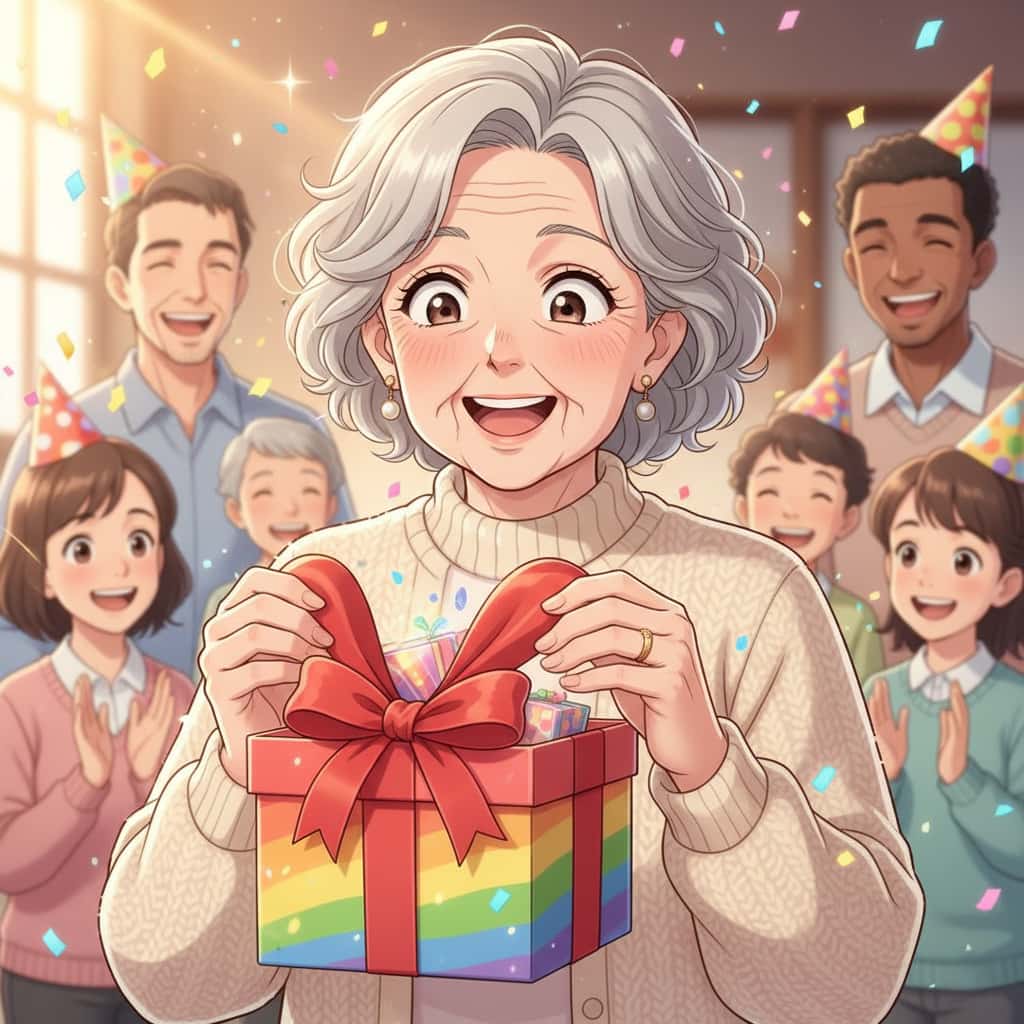 anime style, elderly person, expression of joy and surprise, opening a present at a birthday party, confetti flying, happy family in background