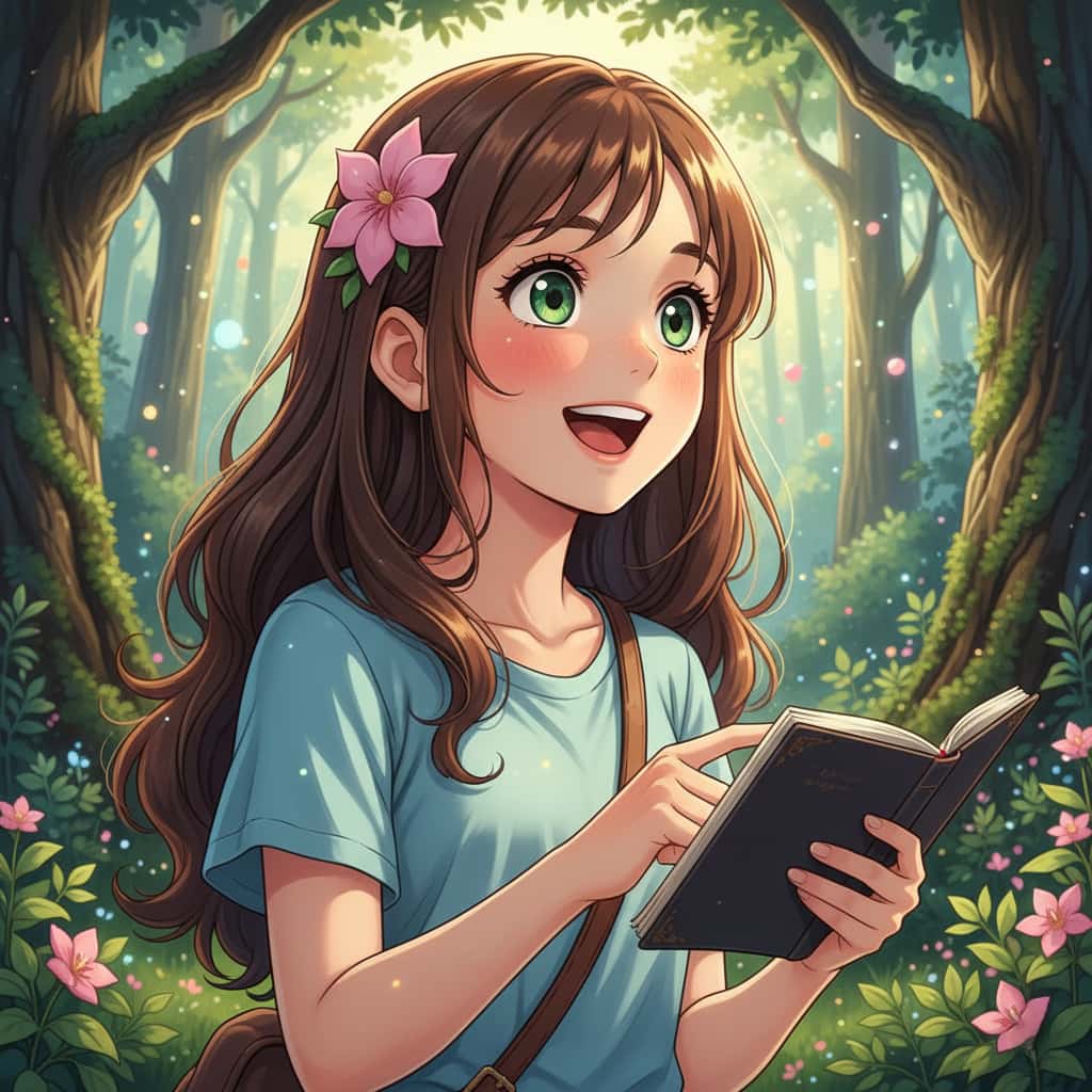 anime style, lively and curious girl, sparkling eyes, look of wonder, enchanted forest background, highly detailed, vibrant colors