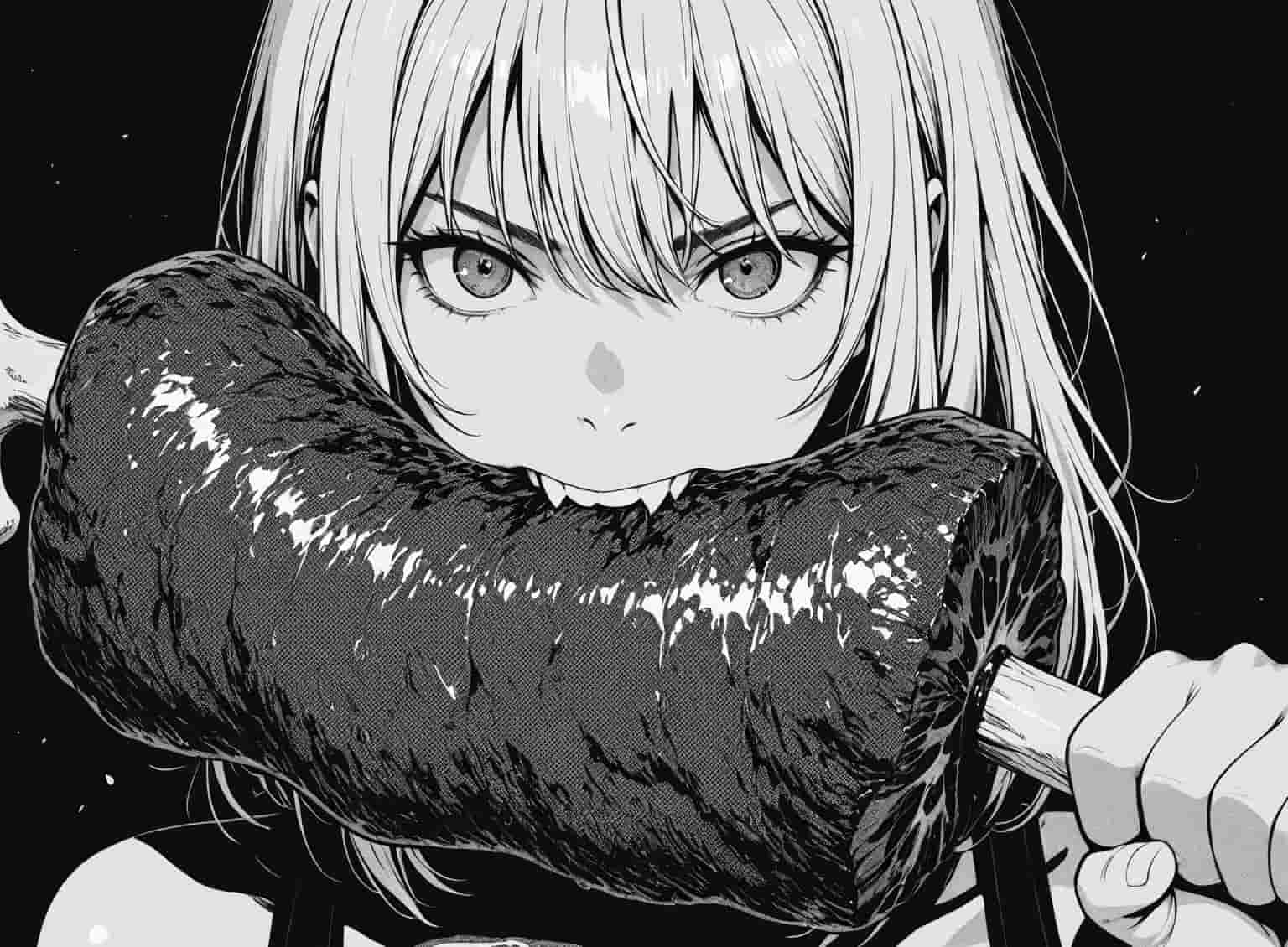 線とトーン(網点)が際立つ、日本のコミックスタイルを強くAIに認識させます。 - 肉の形状と大きさを誇張させる