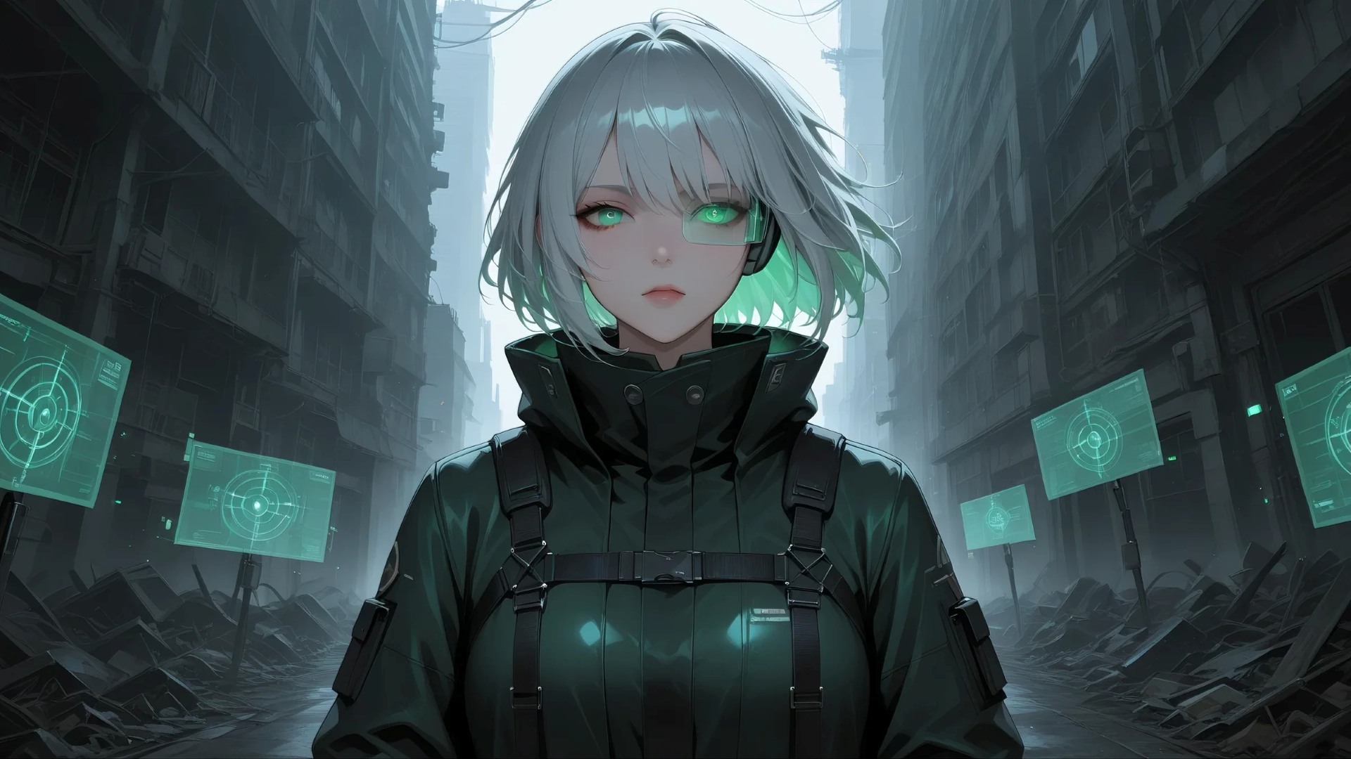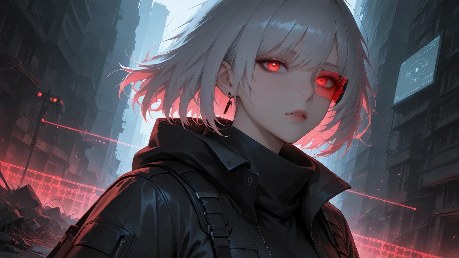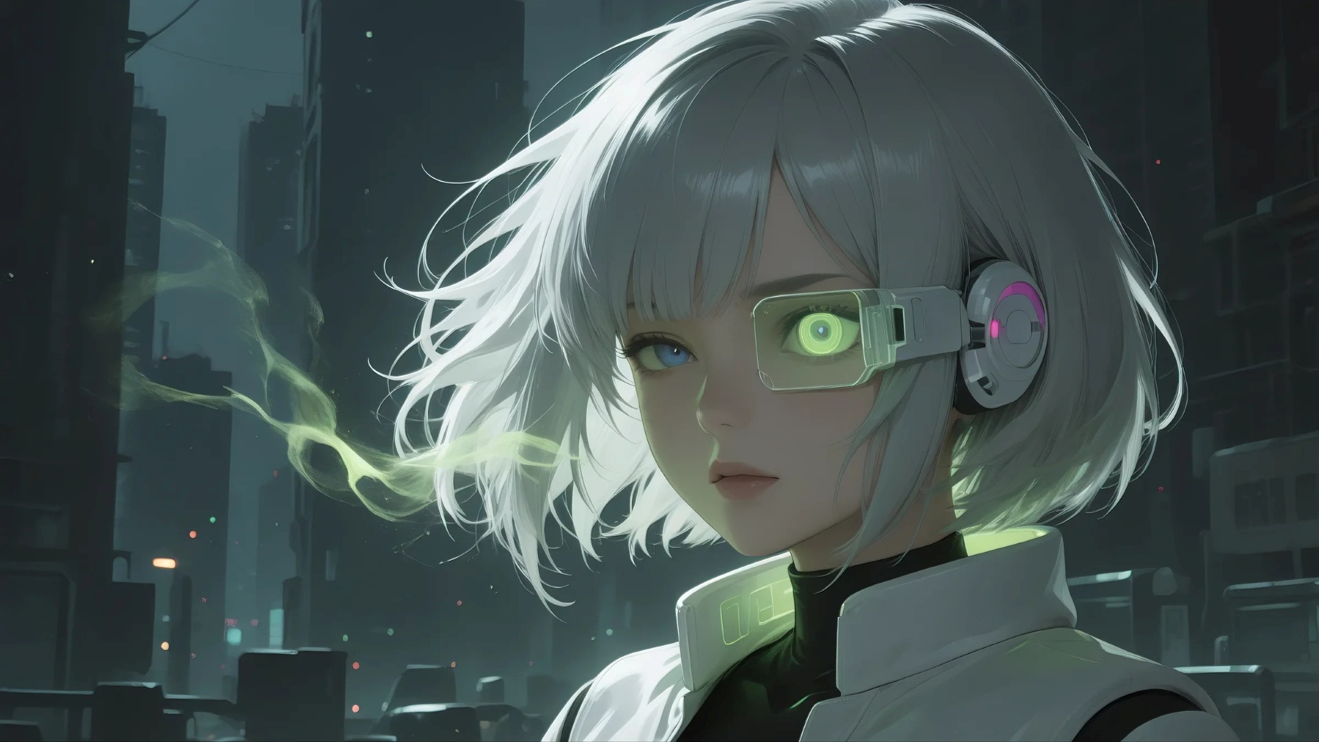この画像は、銀髪ショートボブの女性が、戦闘力をはかる「スカウター」をつけているシーンです。相手を見据えるような顔の凛々しさが印象的です。